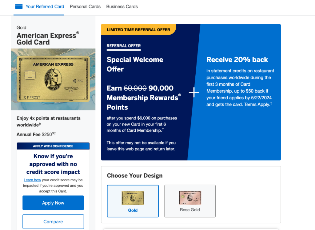 Don't have the American Express Gold yet? You can use our personal referral link to pull up the 90,000-point offer. You may need to open the link in an incognito or private web browser or even try different devices.